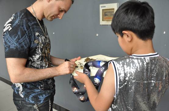 下课后,十几位学生们纷纷拿出自己的吉他给两位大师签名并合影留念,其中便有法丽达D-10,子午线XD-SUP2。