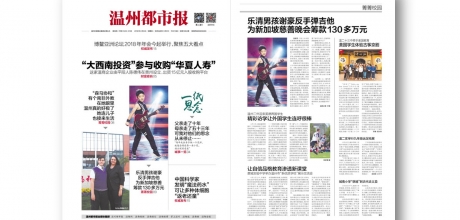 【法丽达在线讯】近日,谢豪受新加坡国家电视台邀请参加《太和观一心一德为善乐》慈善直播晚会,与众多知名艺人一同为慈善筹款。作为本次晚会最小的表演嘉宾,他持法丽达电吉他表演了《大黄蜂的飞行》,还上演了一出...