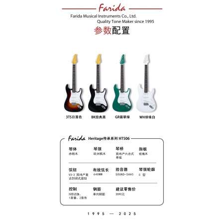 HT-506延续Heritage系列的核心理念,所有升级都围绕更好的演奏体验和经典音色展开,以经典的ST琴型设计、三单线圈拾音器配置(SSS)和卓越的性价比,致敬传奇的典范之作